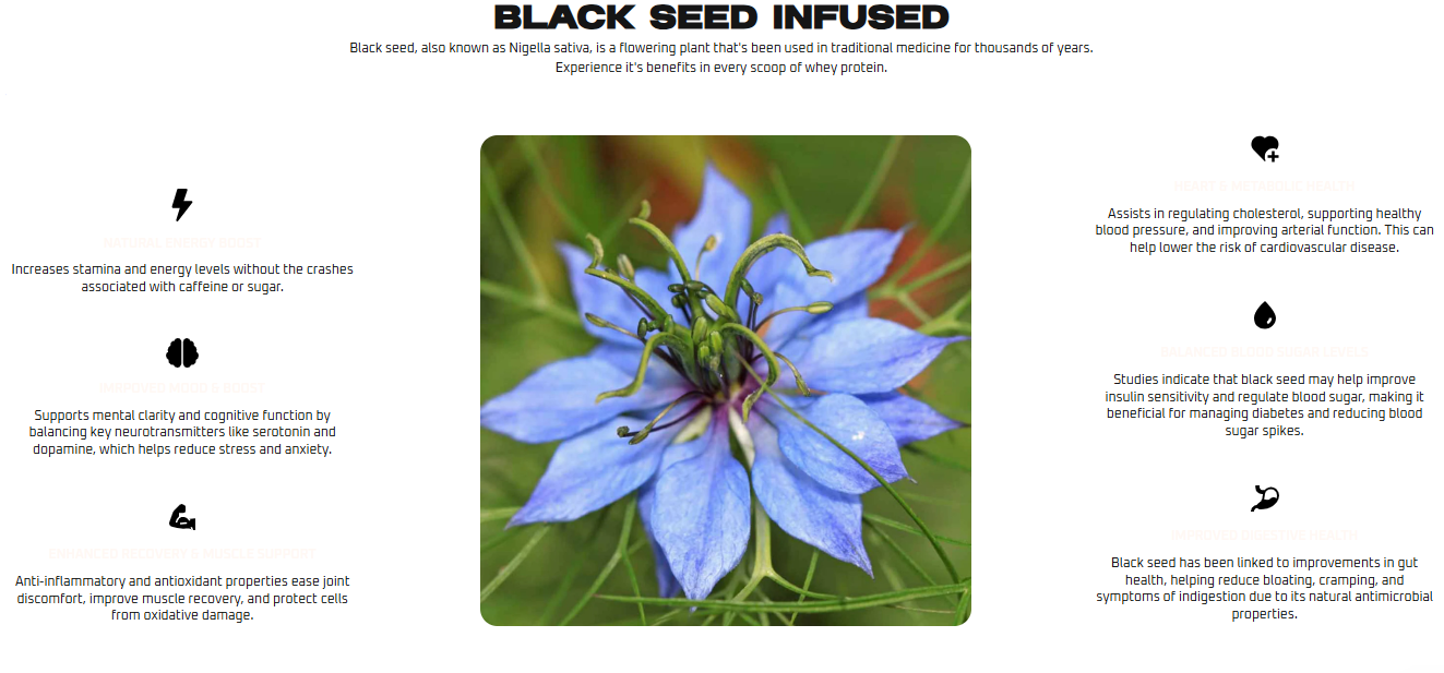 Our flagship ingredient, Black Seed, has been revered for centuries for its health benefits, and we've blended this ancient superfood with modern nutritional science to create products that fuel your fitness journey. From Mango Lassi to Masala Chai, each flavor is a celebration of culture, bringing you a deliciously unique experience while meeting your nutritional needs.
